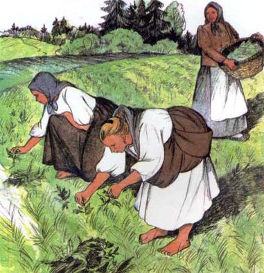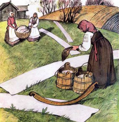 Когда холст был готов, стали его на морозе морозить, по снегу расстилать, а весной расстилали его по траве, на солнышке, и взбрызгивали водой. Сделался холст из серого белым, как кипень.