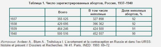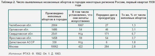 В числе зарегистрированных абортов в России в целом аборты по медицинским показаниям (разрешенные) составляли в эти годы менее 10%, остальные были начаты вне лечебного учреждения. По отдельным регионам доля неполных абортов была еще выше: например, в первом квартале 1938 года в городах Челябинской области она составила 95% от числа всех абортов, а в городах Ярославской области — 98%10. Какая часть неполных абортов — действительно носила криминальный характер, сказать невозможно, но на основе данных о том, что примерно треть женщин с внебольничным абортом поступили в больницы с септическим состоянием,