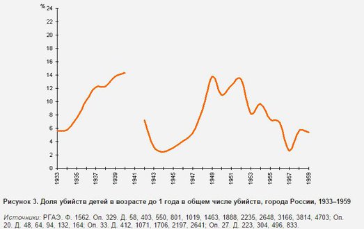 В годы войны эти показатели снизились, а после войны доля убийств детей в возрасте до 1 года в общем числе убийств вновь приблизилась к уровню конца 1930-х годов (рис. 3). В 1952 и 1953 годах в городах было зарегистрировано по 398 убийств младенцев28.
