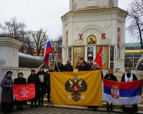 Именно поэтому в руках у молитвенников за православных сербов-черногорцев были и Личный штандарт Его Императорского Величества Государя Императора Николая II, флаги Сербии и России и даже Знамя Победы в Великой Отечественной войне, обагрённое кровью Новомучеников Церкви Русской и Церкви Сербской, вымоливших эту Победу своими голгофскими страданиями за Веру. Это Знамя являет собой символ нашего боевого единства в общей борьбе против фашизма, но сегодня оно ещё и грозное предупреждение тем, кто попытается вновь посягнуть на нашу свободу и наших братьев.