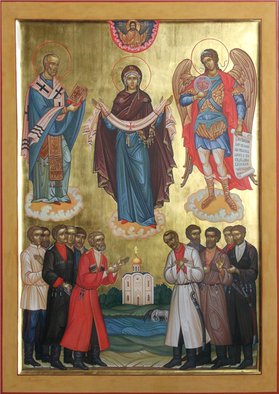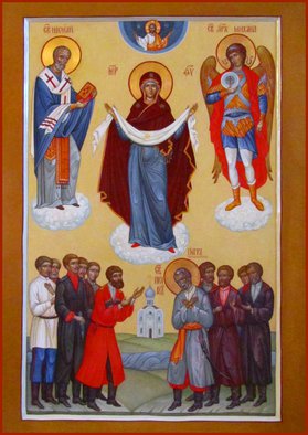 Поскольку образ Святого Николая Угодника почитаем казачеством, то он, конечно, присутствует в иконах Покрова Пресвятой Богородицы с предстоящими казаками как их предстатель пред Божией Матерью. Подобный образ изображён на Знамени исторического Кубанского казачьего хора.