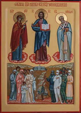 На иконе "Образ Господа Нашего Иисуса Христа Чернобыльский" Святитель Николай ходатайствует пред Спасителем за души погибших и живых ликвидаторов страшной атомной катастрофы.