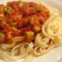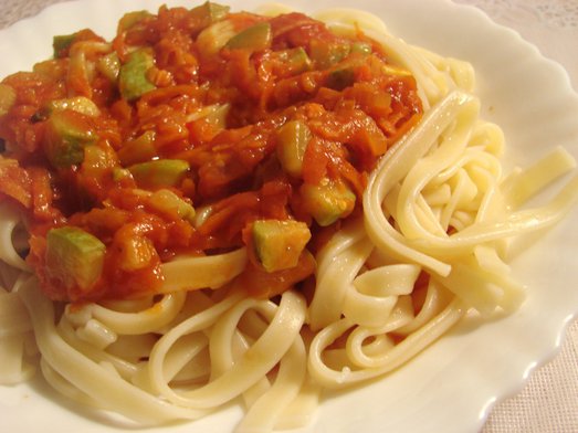 Лук и морковь немного обжарить, добавить нарезанный кубиками кабачок, протертые помидоры, немного томатной пасты, соль, орегано или др. ваши любимые специи и тушить до готовности. Соус добавить в любую пасту( макароны). Ну очень вкусно:сладенькие кабачки и кислинка помидор!