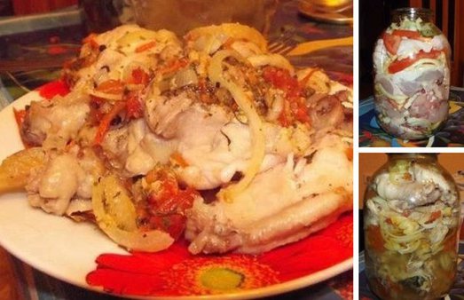 Делаю я подобным способом лет 20, только беру бедрышки курицы в нужном количестве, укладываю в литровые банки, не доходя до края банки примерно на 2 пальца /в процессе приготовления бульон кипит/. А сами кусочки курицы предварительно обмакиваю в соусе, который может быть разнообразным. Банки можно оставить до остывания, потом поменять металлические крышки на капроновые и поставить в холодильник. Очень вкусно в холодном виде.
