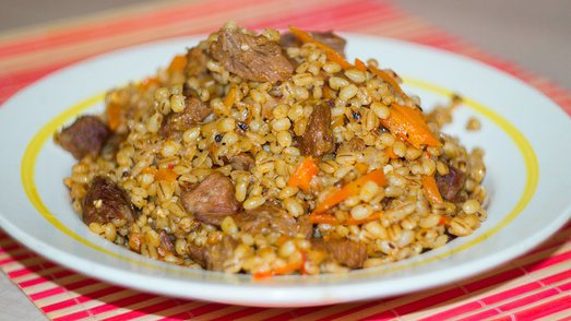 12. Обжаренную перловку выкладываем в казан, равномерно распределяем и заливаем кипятком, он должен подниматься нам крупой на 2 сантиметра.