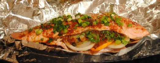 4. На лист фольги выложить фаршированную рыбку и посыпать сверху зеленым луком.
