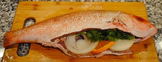 3. Подготовленную рыбку нафаршировать петрушкой. Добавить в брюшко пару ломтиков апельсина (можно использовать и традиционный лимон). При желании можно добавить также пару колечек лука.