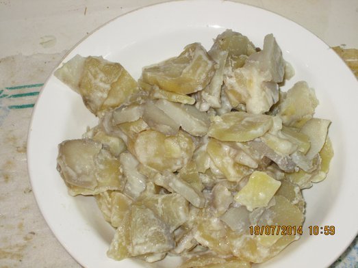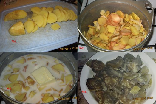 4. Положить в кастрюлю и залить молоком, добавить немножко воды. Посолить и перемешать картофель. Количество соли – как обычно солят картофель.