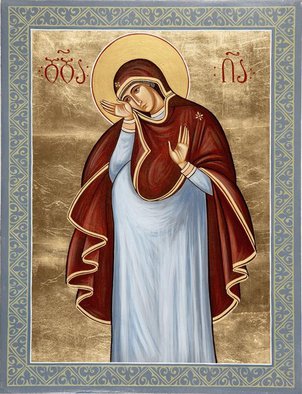 Богородица предстоит на образе, подняв правую руку к голове, утирая слезы, а левою указывает Иосифу, что «мужа не знает» и является Девой.