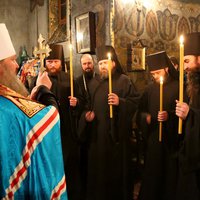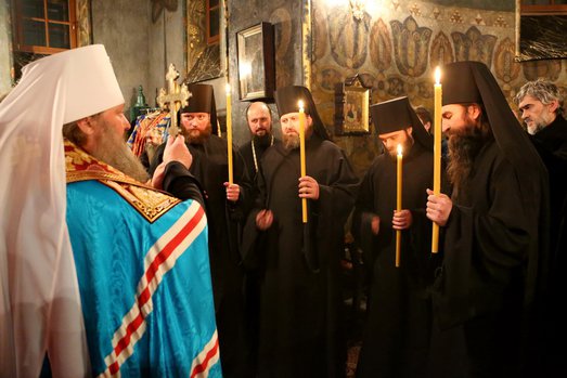 Накануне вечером митрополит Павел возглавил вечернее богослужение в Трапезном храме преподобных Антония и Феодосия Печерских. Во время вечерни владыка Павел совершил иноческий постриг над насельниками монастыря послушниками Дионисием, Евгением, Димитрием и Евгением с именами Аверкий, Христодул, Наум и Филумен. За богослужением молился архиепископ Ровеньковский и Свердловский Пантелеимон.