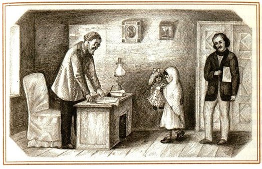 Николай Петрович Бугров, издатель и редактор К-ской газеты, высокий худой старик, носил очки на носу, что придавало ему строгий вид (хотя он был очень добрый, мягкосердечный человек). Взглянув на часы, издатель собрался было приказать единственному оставшемуся в редакции сотруднику, давно уже потихоньку зевавшему, тушить огонь и собираться домой. В этот момент дверь быстро отворилась, и на пороге показалась запыхавшаяся маленькая девочка, закутанная в большой старый платок.