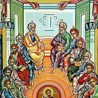 Видением огненных языков, во свете и дыхании бурнем и радостотворнем сниде Дух Святый на апостолов. Пламенем Его объятии, рыбари мир весь в Церковь Христову призваша, беды на суши и водах радостно терпяще, лютых смертей не убояшася, и во всю землю изыде вещание их: Аллилуиа.