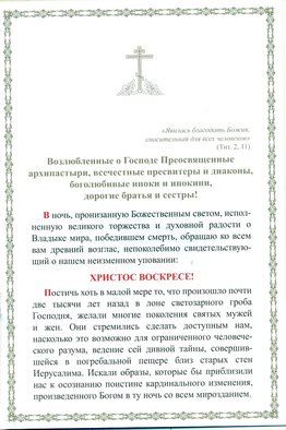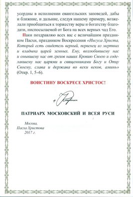 Пасхальное послание Святейшего Патриарха Кирилла архипастырям, пастырям, диаконам, монашествующим и всем верным чадам Русской Православной Церкви