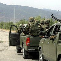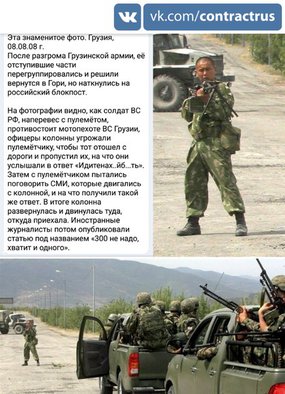После разгрома Грузинской армии, её отступившие части перегруппировались и решили вернуться в Гори, но наткнулись на российский блокпост. На фотографии видно, как солдат ВС РФ, наперевес с пулемётом, противостоит мотопехоте ВС Грузии. Офицеры колонны угрожали пулемётчику, чтобы тот отошел с дороги и пропустил их, на что они услышали в ответ «Иди......». Затем с пулемётчиком пытались поговорить СМИ, которые двигались с колонной, на что получили такой же ответ. В итоге колонна развернулась и двинулась туда, откуда приехала.