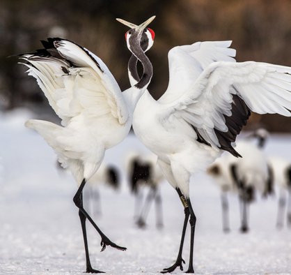 Ухаживания журавлей — это целый захватывающий ритуал. Тут и подпрыгивания с небольшими перебежками, и хлопанья крыльями с наклонами и пританцовываниями, и подбрасывания пучков травы вверх. В завершение состоявшаяся пара «закрепляет результат» совместным пением. И продолжает до тех пор, пока не начинает петь в унисон.