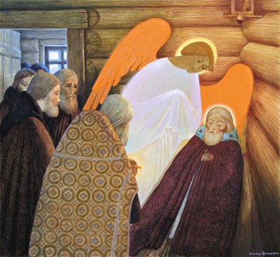 У порога Вечности. Отшествие ко Господу прп. Сергия Радонежского.......В сентябре месяце он впал в тяжелый недуг и, почувствовав свою кончину, призвал к себе братию. Когда она собралась, преподобный в последний раз обратился к ней с поучением и наставлением; он увещевал иноков пребывать в вере и единомыслии, умолял их сохранять чистоту душевную и телесную, завещал питать ко всем нелицемерную любовь, советовал им удаляться от злых похотей и страстей, наблюдать умеренность в пище и питье, убеждал не забывать страннолюбия и быть смиренными, бежать от земной славы. Наконец он сказал им: