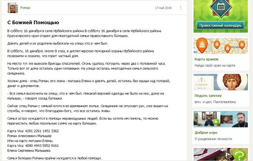 мошенник распространяет просьбы о помощи священнику-погорельцу Роману Алексеевичу Малышеву из села Ирбейского района Красноярского края. !