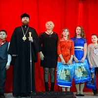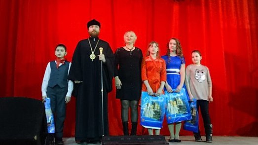 Епископ Григорий и зам. главы г. Троицка Елена Василяускене после поздравлений вручили призы победителям детского творческого Рождественского конкурса.