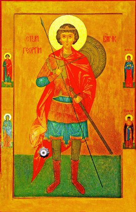 Святой Георгий был родом из Каппадокии (область в Малой Азии), вырос в глубоко верующей христианской семье. Его отец принял мученическую кончину за Христа, когда Георгий был еще в детском возрасте. Мать, владевшая имениями в Палестине, переселилась с сыном на родину и воспитала его в строгом благочестии. Поступив на службу в римское войско, святой Георгий, красивый, мужественный и храбрый в сражениях, был замечен императором Диоклетианом (284-305) и принят в его стражу со званием комита — одного из старших военачальников. Император-язычник, много сделавший для возрождения римского могущества и ясно понимавший, какую опасность представляет для языческой цивилизации торжество Распятого Спасителя, в последние годы правления особенно усилил гонения на христиан. На совете сената в Никомидии Диоклитиан предоставил всем правителям полную свободу в расправе над христианами и обещал свою всемерную помощь. Святой Георгий, узнав о решении императора, раздал нищим свое наследство, отпустил на волю рабов и явился в Сенат. Мужественный воин Христов открыто выступил против императорского замысла, исповедал себя христианином и призвал всех признать истинную веру во Христа: «Я раб Христа, Бога моего, и, уповая на Него, предстал среди вас по своей воле, чтобы свидетельствовать об Истине». «Что есть Истина?» — повторил вопрос Пилата один из сановников. «Истина есть Сам Христос, гонимый вами», — отвечал святой. Ошеломленный дерзновенной речью доблестного воина, император, который любил и возвышал Георгия, попытался уговорить его не губить своей молодости, славы и чести, но принести, по обычаю римлян, жертву богам. На это последовал решительный ответ исповедника: «Ничто в этой непостоянной жизни не ослабит моего желания служить Богу». Тогда, по приказу разгневанного императора, оруженосцы стали копьями выталкивать святого Георгия из зала собрания, чтобы увести в темницу. Но сама смертоносная сталь становилась мягкой и гнулась, как только копья касались тела святого, и не причиняла ему боли. В темнице мученику забили ноги в колодки и придавили грудь тяжелым камнем. На другой день на допросе, обессиленный, но твердый духом, святой Георгий вновь отвечал императору: «Скорее ты изнеможешь, мучая меня, нежели я, мучимый тобою».