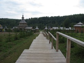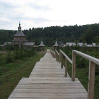 К источнику ведет деревянная лестница с несколькими площадками для отдыха. Справа от нее купальня, состоящая из открытого водоема под крышей и закрытого помещения, куда сверху плотной струей спадает вода по деревянному лотку.