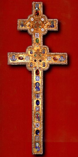Крест, украшенный многочисленными перегородчатыми эмалями,- этапное произведение прикладного искусства Древней Руси. На пластинах креста помещена пространная надпись. В ней сообщается, из каких материалов, когда сделан крест, сколько он стоит, указано имя мастера. Изготовлен он был как ковчег для хранения христианских реликвий. Крест 6-конечный, высота 51, 8 см., длина верхнего перекрестия 14 см., нижнего - 21 см. Основа из кипарисового дерева, сверху и снизу покрыт 21 золотой пластинкой с драгоценными камнями, орнаментом и 20 серебряными позолоченными пластинками; край передней стороны креста обрамлен ниткой жемчуга. Пластины передней стороны представляют собой иконописную композицию - великий, или расширенный деисус. На верхних концах креста поясные изображения Христа, Матери Божией, Иоанна Предтечи. В центре нижнего перекрестия - четыре евангелиста, на концах - архангелы Михаил и Гавриил. В нижней части креста, после перекрестия - небесные покровители заказчицы и ее родителей: святая Ефросиния Александрийская, святой великомученик Георгий и святая София. В верхнем перекрестии прикреплен небольшой 4-конечный, а в нижнем - 6-конечный крестики. На обратной стороне креста образы отцов церкви святого Иоанна Златоуста, святого Василия Великого, святого Григория Назианзина (Богослова), апостолов Петра и Павла, святого Стефана, святого Димитрия, святого Пантелеимона. Над каждым образком частично греческими, частично славянскими буквами сделаны надписи.