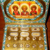 Малый ковчег-мощевик содержит св. мощи 18 святых.