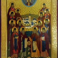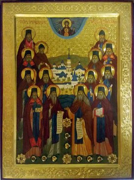 На иконе закреплены ковчежцы с 12-ю частицами мощей святых Оптинских старцев: