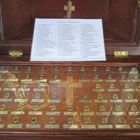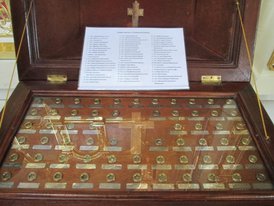 Мощевик с 61 частицами Оптинских и многих чтимых святых как ранней церкви, так и поздних времен, а также частицами Гроба и Креста Господня, Маврийского дуба и камня с горы Искушений, содержит частицы мощей святых: