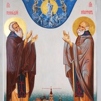 Мира красоту и яже в нем тленная Оставивше и все умное свое желание К Богу вперивше, Того Крест Нарамо взлемше дарование чудес От Христа прияли есте. И ныне Предстояще Святей Троице, поминайте нас, чад ваших, яже собрали есте мудрии. Сего ради вопием вам: радуйтеся Преподобнии Отцы наша Геннадие и Никифоре.