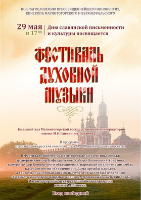 29 мая 2016 года в большой концертном зале Магнитогорской государственной консерватории им.М.И.Глинки, по благословению Преосвященнейшего Иннокентия, епископа Магнитогорского и Верхнеуральского, в рамках празднования Дня славянской письменности и культуры, состоится Фестиваль духовной музыки.