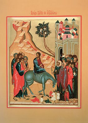 Кондак: «На престоле на Небеси,/ на жребяти на земли носимый, Христе Боже,/ Ангелов хваление и детей воспевание/ приял еси зовущих Ти:// благословен еси, грядый Адама воззвати».
