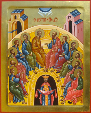 Егда́ снизше́д язы́ки слия́,/ разделя́ше язы́ки Вы́шний,/ егда́ же о́гненныя язы́ки раздая́ше,/ в соедине́ние вся́ призва́,// и согла́сно сла́вим Всесвята́го Ду́ха.