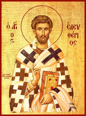 И нра́вом прича́стник,/ и престо́лом наме́стник апо́столом быв,/ дея́ние обре́л еси́, Богодухнове́нне,/ в виде́ния восхо́д:/ сего́ ра́ди сло́во и́стины исправля́я,/ и ве́ры ра́ди пострада́л еси́ да́же до кро́ве,/ священному́чениче Елевфе́рие,// моли́ Христа́ Бо́га спасти́ся душа́м на́шим.🙏