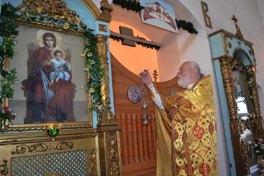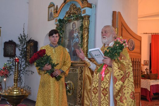 Священник Евгений Тремаскин сказал поздравительное слово и вместе с прихожанами пропели Многолетие! На молитвенную память подарили цветы и икону Богородицы.