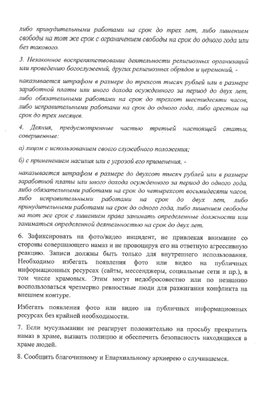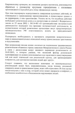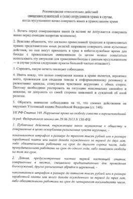 Приложение: документ «Рекомендации относительно действий священнослужителей и (или) сотрудников храма в случае, когда мусульманин начал совершать намаз в православном храме».