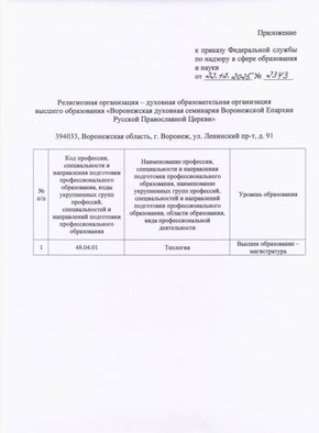 22 декабря 2025 года подписан приказ Федеральной службы по надзору в сфере образования и науки (Рособрнадзора) №2343 о государственной аккредитации магистратуры Воронежской духовной семинарии по направлению подготовки 48.04.01 Теология. Аккредитационная экспертиза была проведена экспертной группой Рособрнадзора с 8 по 18 декабря 2025 года, по результатам которой было принято решения о соответствии образовательной программы магистратуры аккредитационным показателям.