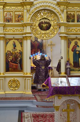 В совершении Литургии свт. Василия Великого Архипастырю сослужили наместник Дивногорского монастыря игумен Алексий (Сукачев) с братией обители в священном сане.