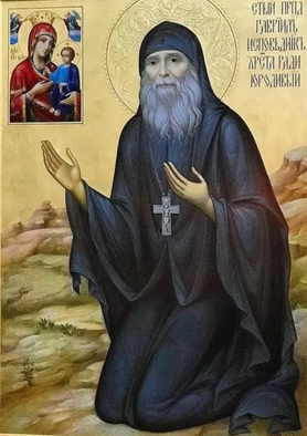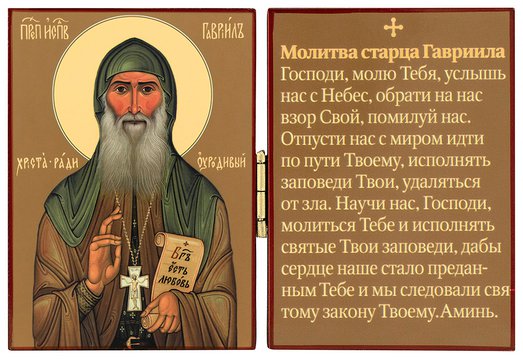 О́, блаже́нне Гаврии́ле, древним отцем подо́бниче и тве́рдый веры испове́дниче, от младенства Госпо́да всем сердцем возлюбивый и ре́вностно Ему после́довавый! Мы же, яко раби́ недостойнии, благочестия и смире́ния не имущии, обаче себе́ на всяк день в души́ велича́ющии, ближних осуждающии, не и́мамы пред Бо́гом, чим оправдатися! Сего ради молим тя: моли́ за нас Господа, да пода́ст нам ум, сло́во Его разуме́ти, да бу́дем не то́кмо слы́шателие, но и ревностнии его творцы и да разуме́ем, я́ко ничесо́же мо́жем, кроме́ по́мощи Бо́жия.