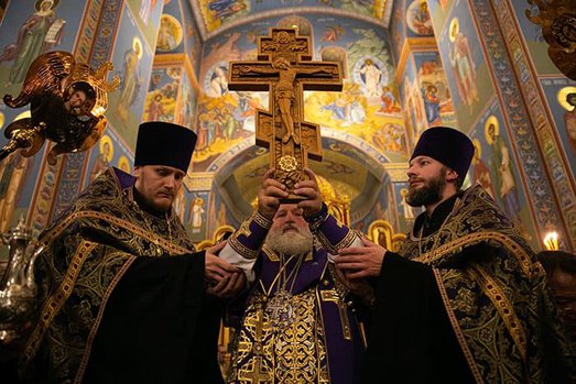 В обычных храмах, где служба совершается без архиерея, у праздника тоже есть свои особенности. Прежде всего это вынос Креста на середину храма в конце вечернего богослужения с земными поклонами и пением тропаря: «Кресту Твоему покланяемся, Владыко, и святое воскресение Твое славим».