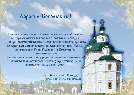З ноября состоится Великое освящение нижнего предела, которое возглавит Высокопреосвященнейший Иосиф, митрополит Улан-Удэнский и Бурятский.