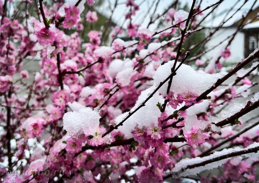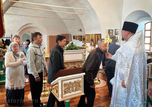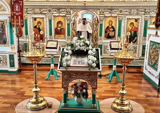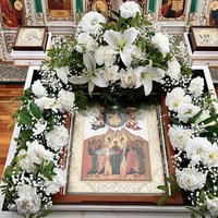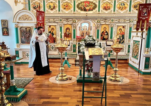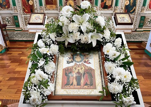 Икона праздника на центральном аналое украшена белыми цветами и облачения в этот день положены белоснежные. Так и природа тоже по-своему встретила Господский праздник: перед всенощным бдением пошел снег и растаял после Божественной Литургии. Распустившиеся цветы, трава, зеленая листва и ели укрылись белым торжественным покровом!