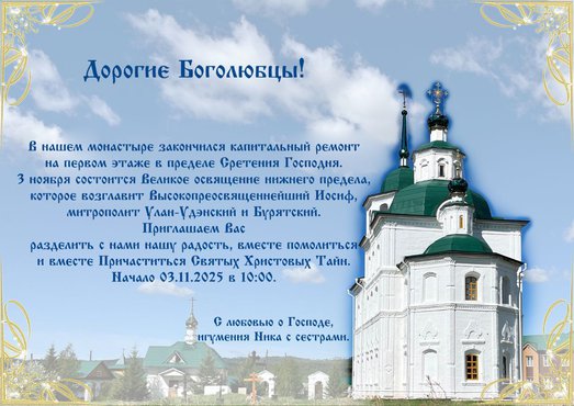 З ноября состоится Великое освящение нижнего предела, которое возглавит Высокопреосвященнейший Иосиф, митрополит Улан-Удэнский и Бурятский.