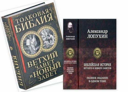 Это книги выдающегося русского библеиста, профессора Санкт-Петербургской духовной академии Александра Павловича Лопухина (1852-1904 г.г.) "Библейская история Ветхого и Нового Завета" и "Толковая Библия: Ветхий Завет и Новый Завет".