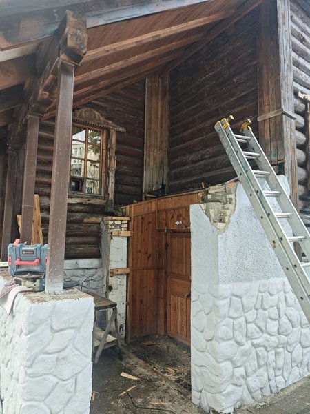 В конце февраля – начале марта 2026 года строители вели благоустройство здания террасы. Рабочие произвели отделку потолка вагонкой. Данный процесс был трудоёмким. Приходилось выпиливать фигурные вырезы в вагоночных досках и стыковать плинтусы при обшивке мест крепления стропил. Также вагонкой был обшит фронт...