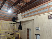 Продолжаются строительные работы. Строители ведут благоустройство здания террасы. Рабочие приступили к отделке потолка вагонкой. Ранее была произведена электрическая разводка на розетки и светильники в этом здании.