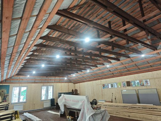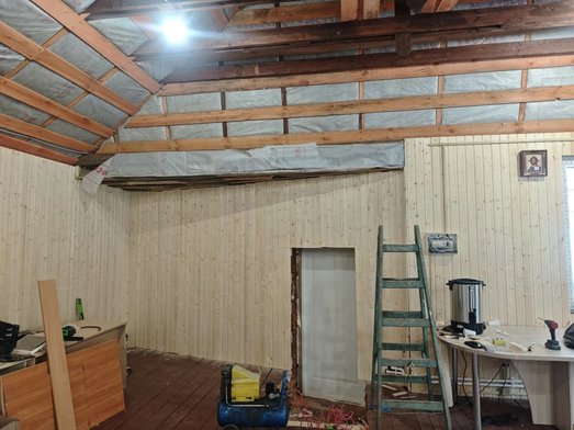 Продолжаются строительные работы. Строители ведут благоустройство здания террасы. Рабочие приступили к отделке потолка вагонкой. Ранее была произведена электрическая разводка на розетки и светильники в этом здании.