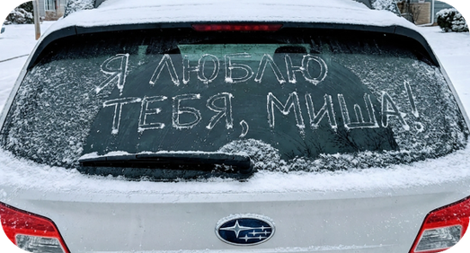 И видит: заднее стекло той машины затонировано вглухую, и на нем большими белыми буквами надпись: «Я люблю тебя, Миша».