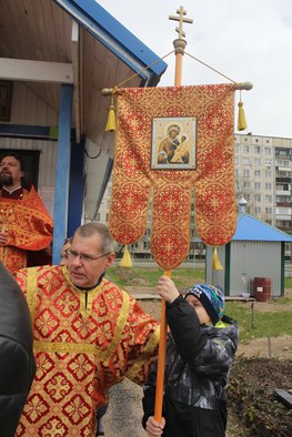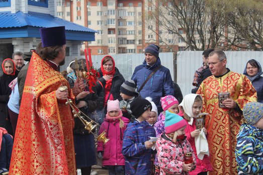 Итак, 02 мая с радостными приветствиями «Христос Воскресе» — «Воистину Воскресе» на территории храма собрались дети в взрослые. Взяли хоругви, иконы: с Богом! Под колокольный звон двинулись вокруг территории храма — вдоль дороги, речки и поликлиники. С остановками, улыбками и радостным смехом под брызги святой воды.