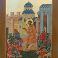 Перевод: На середине праздника жаждущую душу мою благочестия напои водами, ибо всем, Спаситель, Ты воззвал: «Жаждущий пусть идет ко Мне и пьет». Источник жизни (нашей), Христе Боже, слава Тебе!