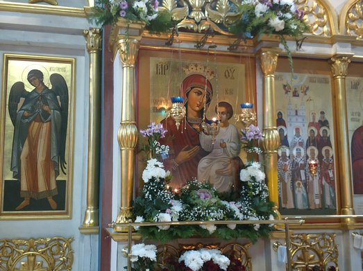 Я́ко пресве́тлая звезда́,/ просия́ Боже́ственными чудесы́/ святы́й о́браз Твой, Изба́вительнице,/ луча́ми благода́ти и милосе́рдия Твоего́/ озари́в в нощи́ скорбе́й су́щих./ Пода́ждь у́бо и нам, Всеблага́я Де́во,/ избавле́ние от...